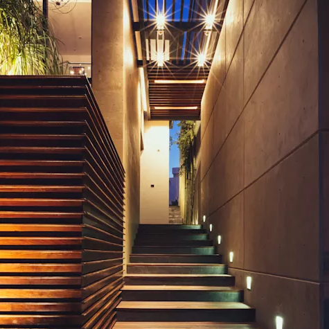 İç veya dış mekanlarda bulunan merdivenleri farklı ışıklandırma çözümleri aydınlatmak hem kullanım kolaylığı sağlar hem de şık bir görüntü oluşturur. Bu örnekte kullanılan solar taş ışıklandırmalar özellikle dış mekan merdivenler için en uygun çözüm olabilir.